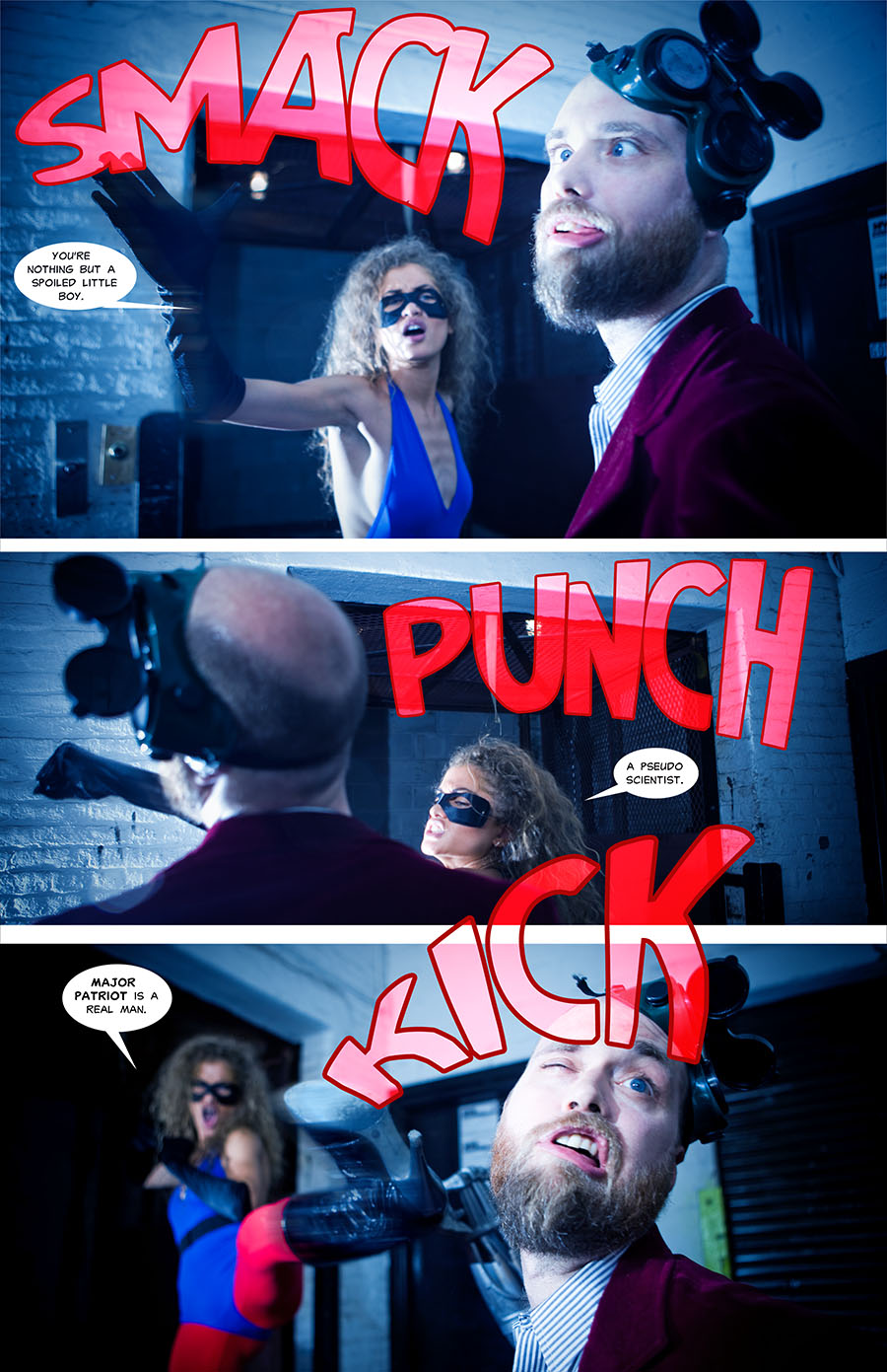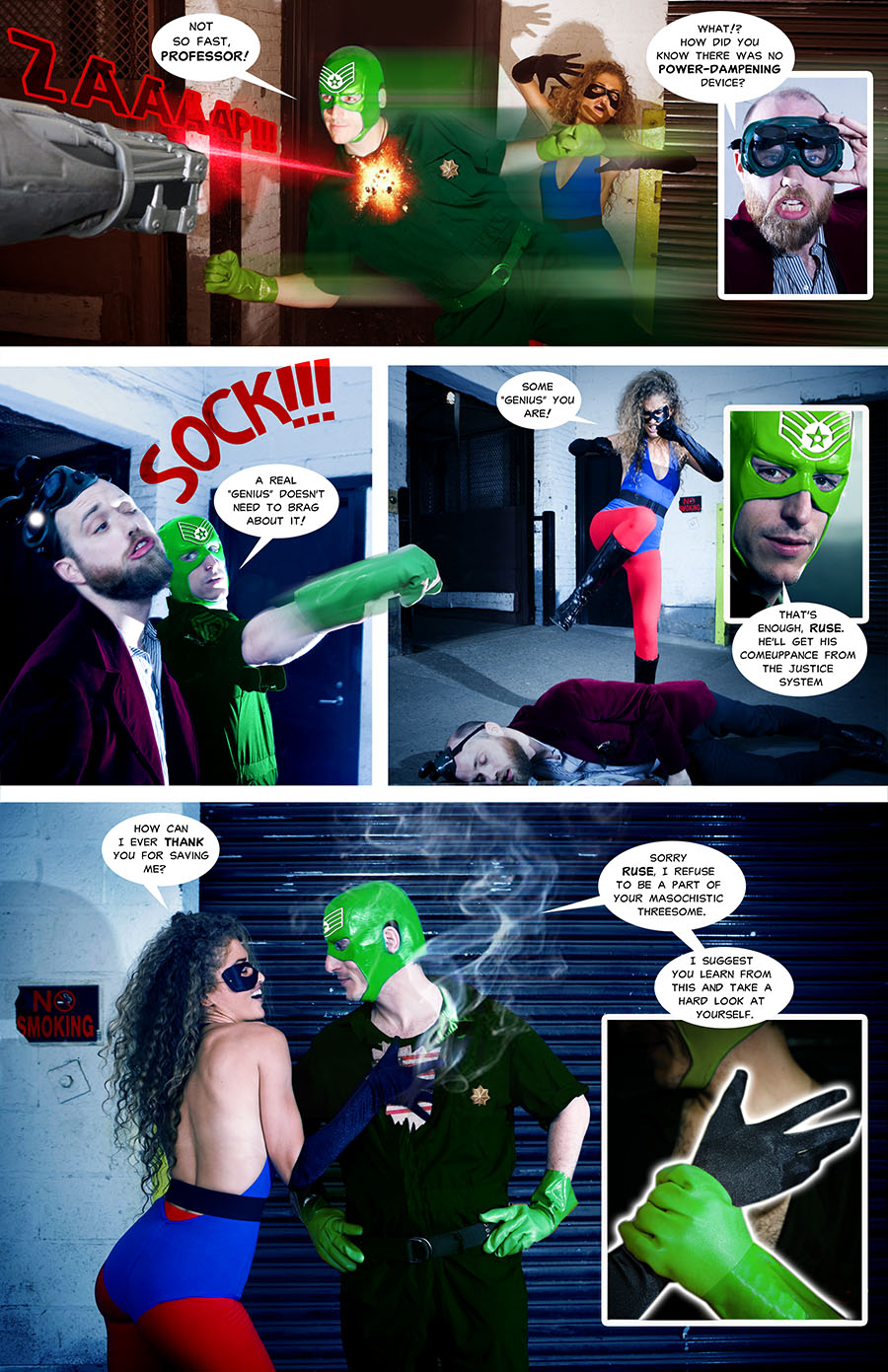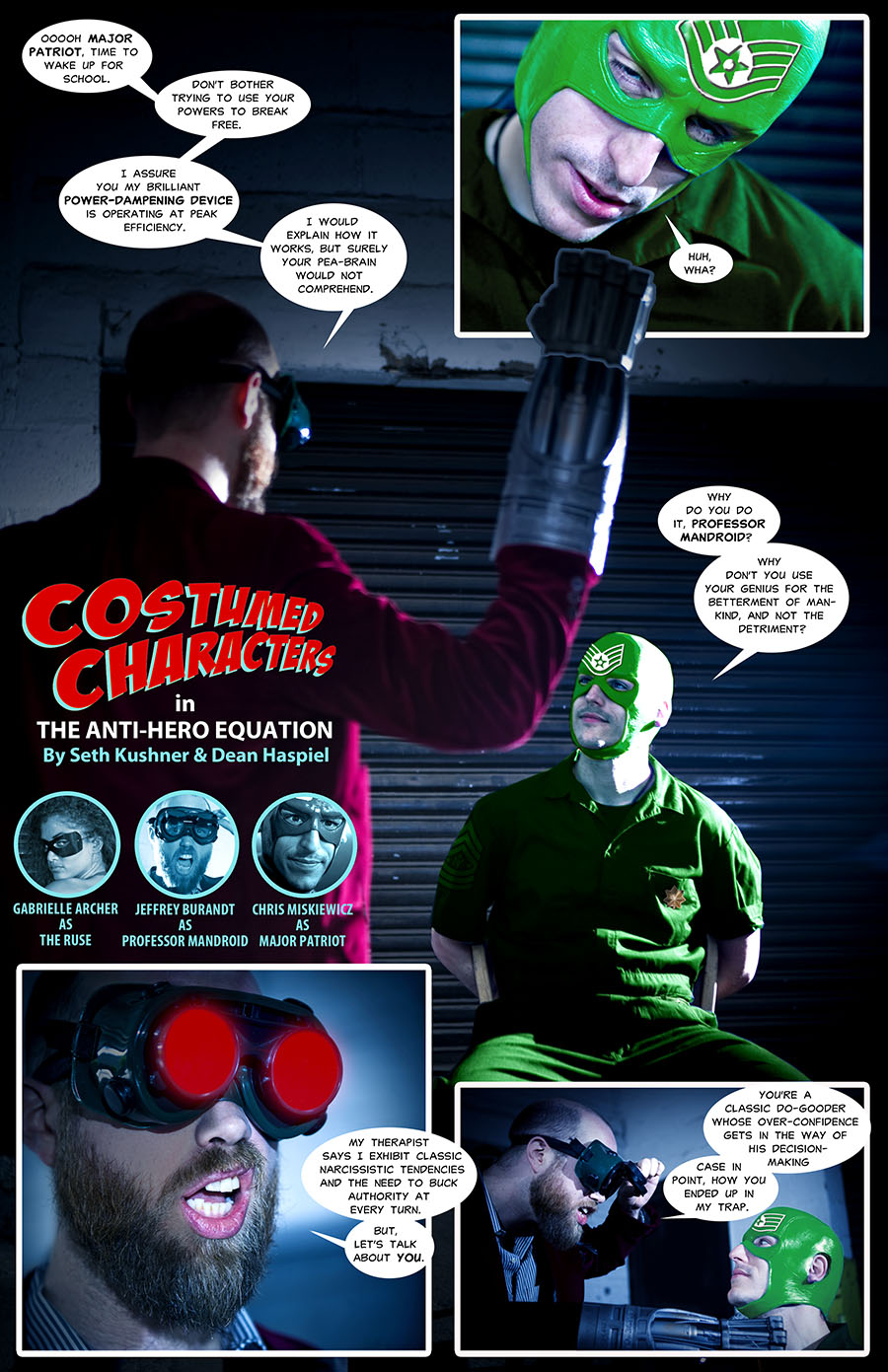 Costumed Characters is done in the spirit of the 1966 Batman TV series. So, it only makes sense that the format for these tales be “live action” fumetti, or photocomics. By utilizing and mixing photography and the language of comics, this series can stand apart from other superhero parodies while still feeling familiar.